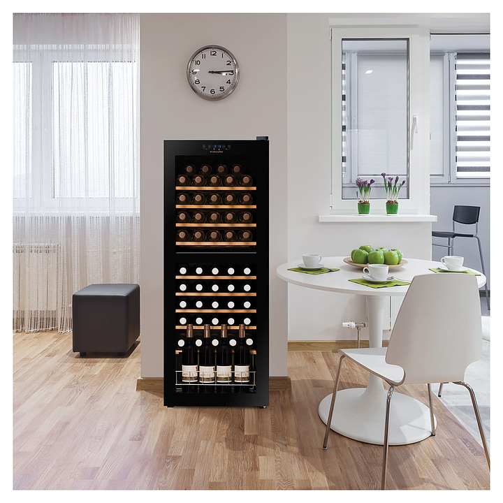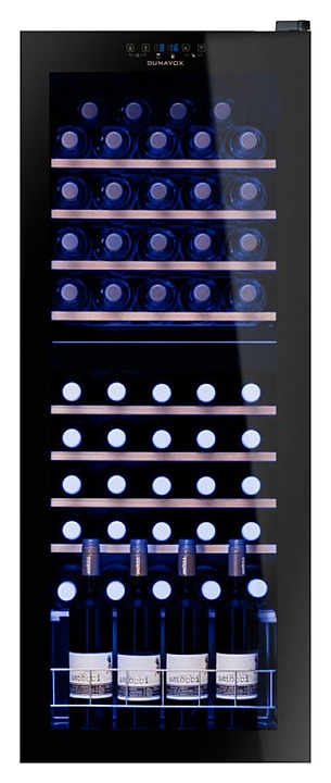 Винный шкаф Dunavox DXFH-54.150 предназначен для демонстрации, хранения и создания оптимальных условий для сохранения всех вкусовых свойств вина в бутылках на предприятиях общественного питания, торговли, в барах, ресторанах, специализированных магазинах, частных домах или квартирах. Модель оснащена сенсорной панелью управления и электронным термостатом. Корпус выполнен из стали, дверь - из рамы черного цвета и двойного тонированного стекла с защитой от ультрафиолетовых лучей, выдвижные полки - из массива бука. Особенности: