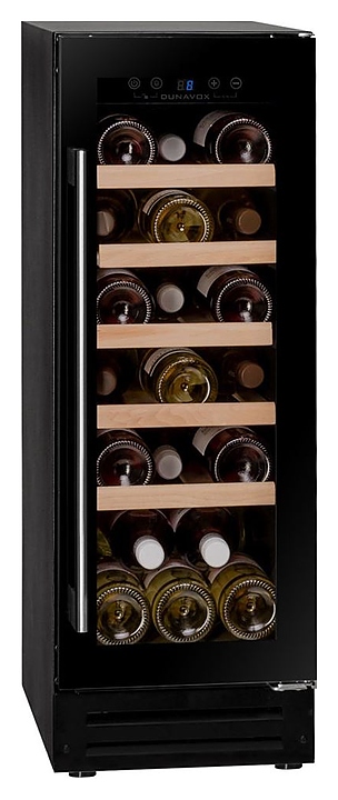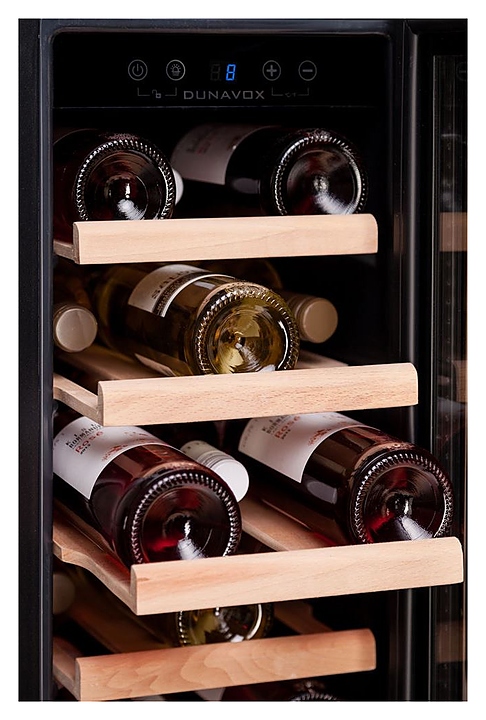 Винный шкаф Dunavox DAUF-19.58B предназначен для демонстрации, хранения и создания оптимальных условий для сохранения всех вкусовых свойств вина в бутылках на предприятиях общественного питания, торговли, в барах, ресторанах, специализированных магазинах, частных домах или квартирах. Модель оснащена сенсорной панелью управления и электронным термостатом. Корпус и ручка выполнены из стали, дверь - из рамы черного цвета и двойного тонированного стекла с защитой от ультрафиолетовых лучей, выдвижные полки - из массива бука. Особенности: