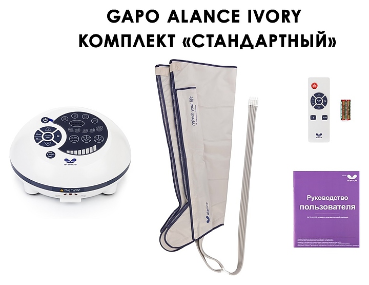 Лимфодренажный массажер Gapo Alance Ivory Стандарт используется в массажных кабинетах, спортивных и спа-центрах, а также в домашних условиях для проведения процедур комплексной оздоровительной пневмо-компрессионной массажной терапии. Компактный блок управления оснащен кабелем питания и многофункциональной панелью со светодиодными лампами индикации. Корпус аппарата изготовлен из ударопрочного пластика, манжеты – из прочной многослойной водонепроницаемой ткани Oxford. Комплектация: