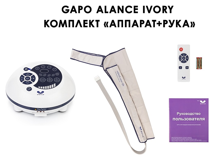 Лимфодренажный массажер Gapo Alance Ivory используется в массажных кабинетах, спортивных и спа-центрах, а также в домашних условиях для проведения процедур комплексной оздоровительной пневмо-компрессионной массажной терапии. Компактный блок управления оснащен кабелем питания и многофункциональной панелью со светодиодными лампами индикации. Корпус аппарата изготовлен из ударопрочного пластика, манжета – из прочной многослойной водонепроницаемой ткани Oxford. Комплектация: