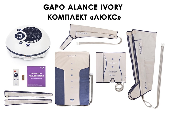 Лимфодренажный массажер Gapo Alance Ivory Люкс используется в массажных кабинетах, спортивных и спа-центрах, а также в домашних условиях для проведения процедур комплексной оздоровительной пневмо-компрессионной массажной терапии. Компактный блок управления оснащен кабелем питания и многофункциональной панелью со светодиодными лампами индикации. Корпус аппарата изготовлен из ударопрочного пластика, манжеты – из прочной многослойной водонепроницаемой ткани Oxford. Комплектация: