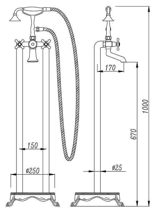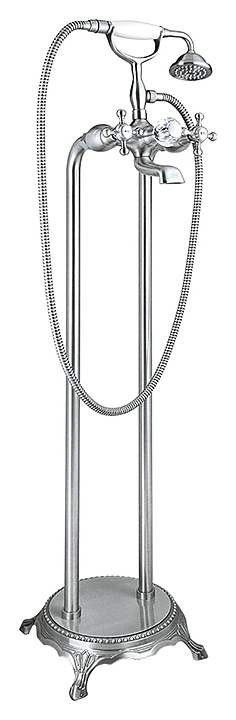 Напольный смеситель для ванны с душем TIMO Nelson 1900/00Y-CR предназначен для использования в ванных помещениях для подачи горячей и холодной воды. Серия выполнена в классическом стиле. Модель оснащена душевым гарнитуром, включающим в себя однорежимную ручную лейку и полутораметровый душевой шланг. Изделие выполнено из высококачественной латуни, отличающейся прочностью, долговечностью и устойчивостью к перепадам температур. В комплект поставки входят корпус смесителя, ручная лейка, душевой шланг, держатель для лейки, соединительные трубы, декоративная площадка и гайки. Особенности: