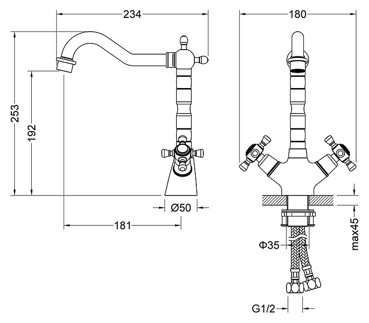 Смеситель для раковины TIMO Nelson 0143/03F предназначен для использования в ванных помещениях для подачи горячей и холодной воды. Серия выполнена в стиле ретро. Модель оснащена керамической кран-буксой для бесшумного смешивания холодной и горячей воды, а также аэратором для создания мягкой ровной струи без разбрызгивания. Изделие выполнено из высококачественной латуни, отличающейся прочностью, долговечностью и устойчивостью к перепадам температур. В комплект поставки входят крепления, аэратор и гибкая подводка. Особенности: