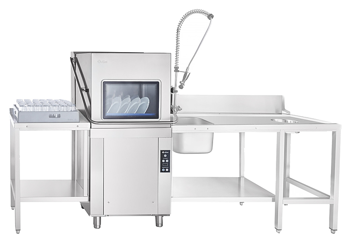 Купольная посудомоечная машина Abat МПК-700К используется на предприятиях общественного питания и торговли для мойки кастрюль, тарелок, стаканов, бокалов, столовых приборов, а также гастроемкостей и противней. Модель оснащена электронной панелью управления и ванной со скругленными углами, облегчающими гигиеническую уборку машины. Детали, контактирующие с водой, и облицовка выполнены из нержавеющей стали AISI 304, основные детали разбрызгивателей - из кислотостойкой нержавеющей стали AISI 321. Купольная посудомоечная машина эксплуатируется с предмоечными столами СПМП-6-1, СПМП-6-3, СПМП-6-5, СПМП-6-7 и раздаточными столами СПМР-6-1 и СПМР-6-5. Комплектация: