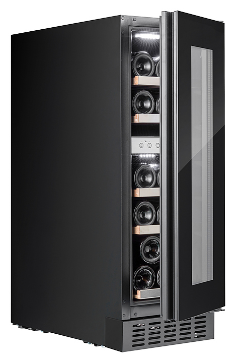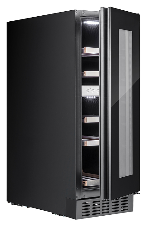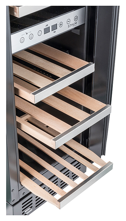 Винный шкаф Temptech STHLM STX30DRB предназначен для охлаждения, хранения и демонстрации бутилированного вина в отелях, винных магазинах, на предприятиях общественного питания и торговли. Модель оснащена сенсорной панелью с дисплеем для регулировки температуры и освещения, 5 выдвижными полками, дверцей со встроенной ручкой и белой светодиодной подсветкой. Дверца выполнена из трехслойного стекла с защитой от УФ-лучей, передняя панель - из черного стекла, полки - из необработанного бука с деталями из нержавеющей стали. Особенности: