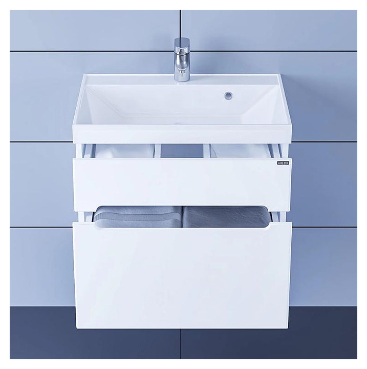 Тумба под раковину СаНта Лондон 60 дополнит интерьер ванной комнаты. Благодаря подвесной конструкции модель не занимает много места, что экономит пространство в ванной комнате и облегчает уборку. Тумба оснащена выдвижными ящиками. Изделие выполнено из МДФ и покрыто ПВХ-пленкой для защиты поверхности от внешних воздействий. Тумба используется вместе с раковиной Classic 60. Особенности: