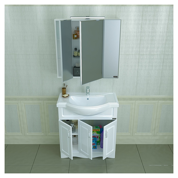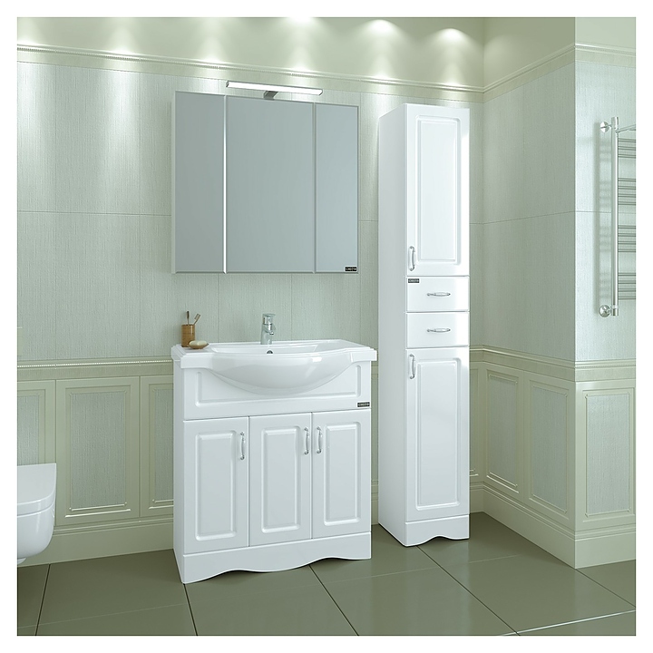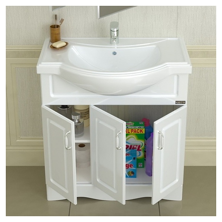 Тумба под раковину СаНта Верона 80 дополнит интерьер ванной комнаты. Модель оснащена 3 распашными дверцами. Корпус выполнен из влагостойкой ЛДСП, фасад - из МДФ и покрыт пленкой для защиты поверхности от внешних воздействий. Тумба используется вместе с раковиной Classic 80. В комплект поставки входят 3 ручки. Особенности: