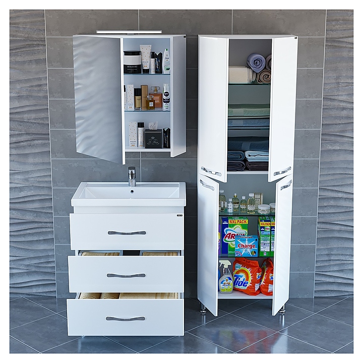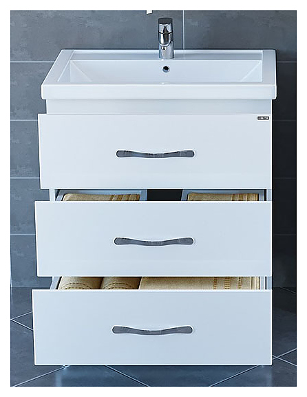 Тумба под раковину СаНта Виктория 70 дополнит интерьер ванной комнаты. Модель оснащена 3 выдвижными ящиками и ножками, защищающими конструкцию от воздействия влаги в случае намокания пола. Корпус выполнен из влагостойкой ЛДСП, фасад - из МДФ и покрыт высокоглянцевой эмалью для защиты поверхности от внешних воздействий. Тумба используется вместе с раковиной Фостер 70. В комплект поставки входят 3 ручки, 2 хромированные и 2 пластиковые ножки. Особенности: