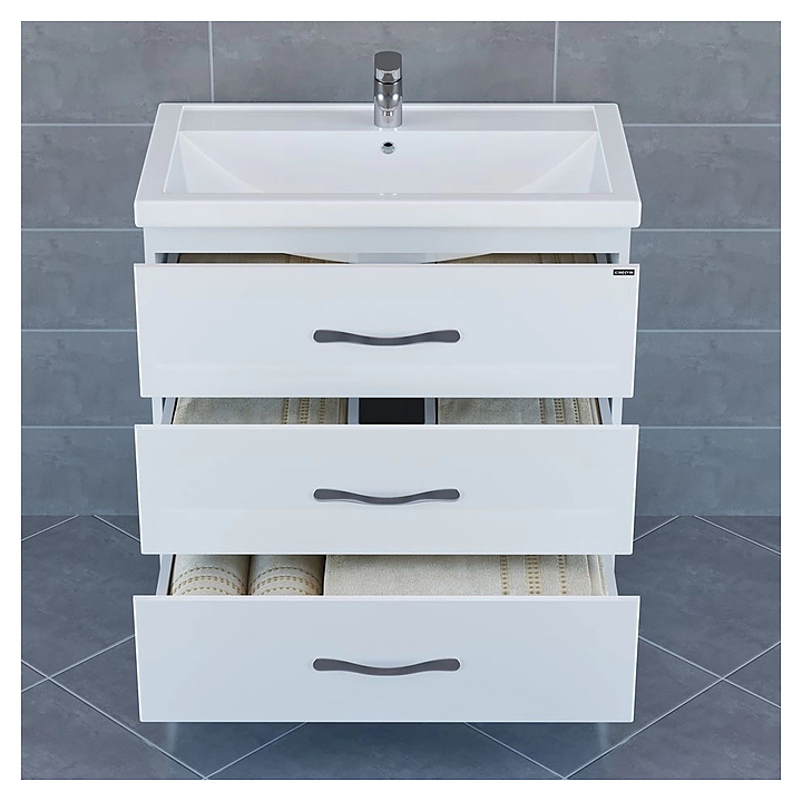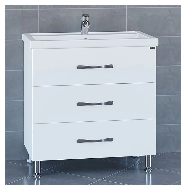 Тумба под раковину СаНта Виктория 80 дополнит интерьер ванной комнаты. Модель оснащена 3 выдвижными ящиками и ножками, защищающими конструкцию от воздействия влаги в случае намокания пола. Корпус выполнен из влагостойкой ЛДСП, фасад - из МДФ и покрыт высокоглянцевой эмалью для защиты поверхности от внешних воздействий. Тумба используется вместе с раковиной Фостер 80. В комплект поставки входят 3 ручки, 2 хромированные и 2 пластиковые ножки. Особенности:
