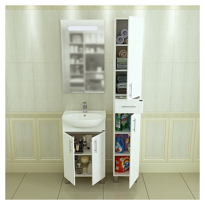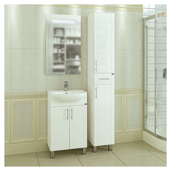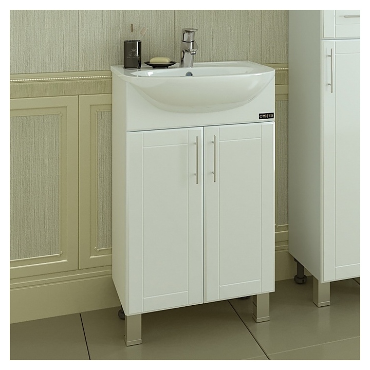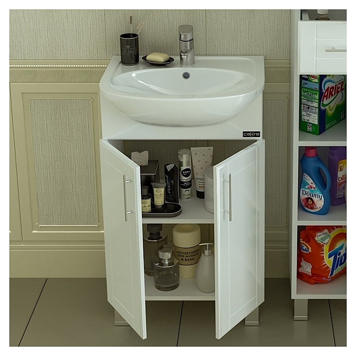 Тумба под раковину СаНта Дублин 50 дополнит интерьер ванной комнаты. Модель оснащена 2 распашными дверцами и ножками, защищающими конструкцию от воздействия влаги в случае намокания пола. Корпус выполнен из влагостойкой ЛДСП, фасад - из МДФ и покрыт пленкой для защиты поверхности от внешних воздействий. Тумба используется вместе с раковиной Уют 50. В комплект поставки входят 2 ручки, 2 хромированные и 2 пластиковые ножки.