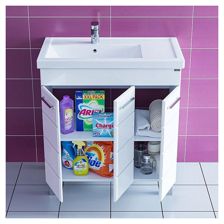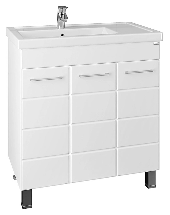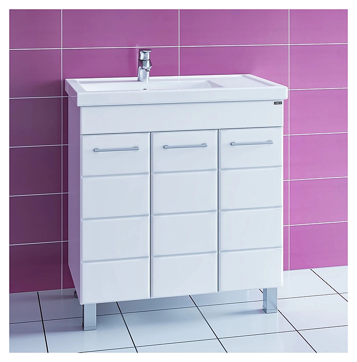 Тумба под раковину СаНта Омега 80 П дополнит интерьер ванной комнаты. Модель оснащена 3 распашными дверцами и ножками, защищающими конструкцию от воздействия влаги в случае намокания пола. Корпус выполнен из влагостойкой ЛДСП, фасад - из МДФ и покрыт пленкой для защиты поверхности от внешних воздействий. Тумба используется вместе с раковиной Фостер 80 П. В комплект поставки входят 3 ручки, 2 хромированные и 2 пластиковые ножки.
