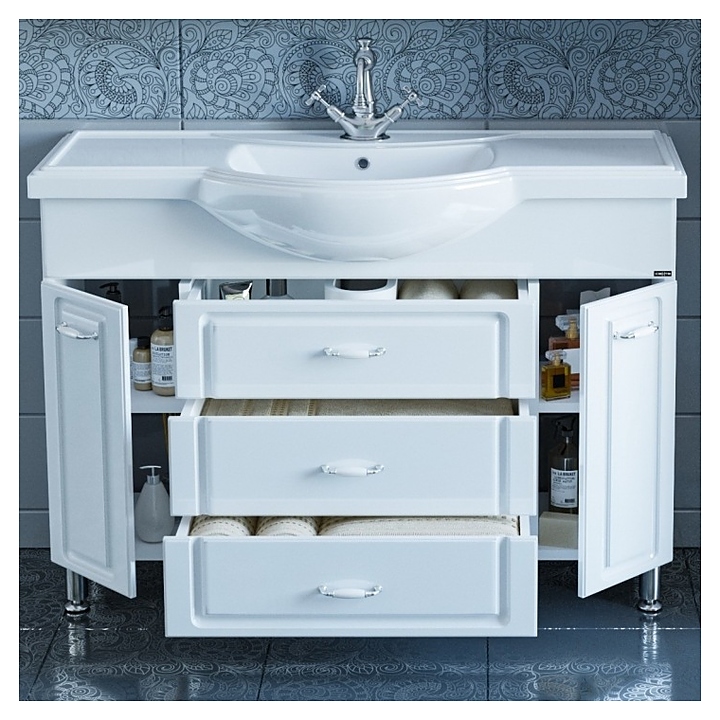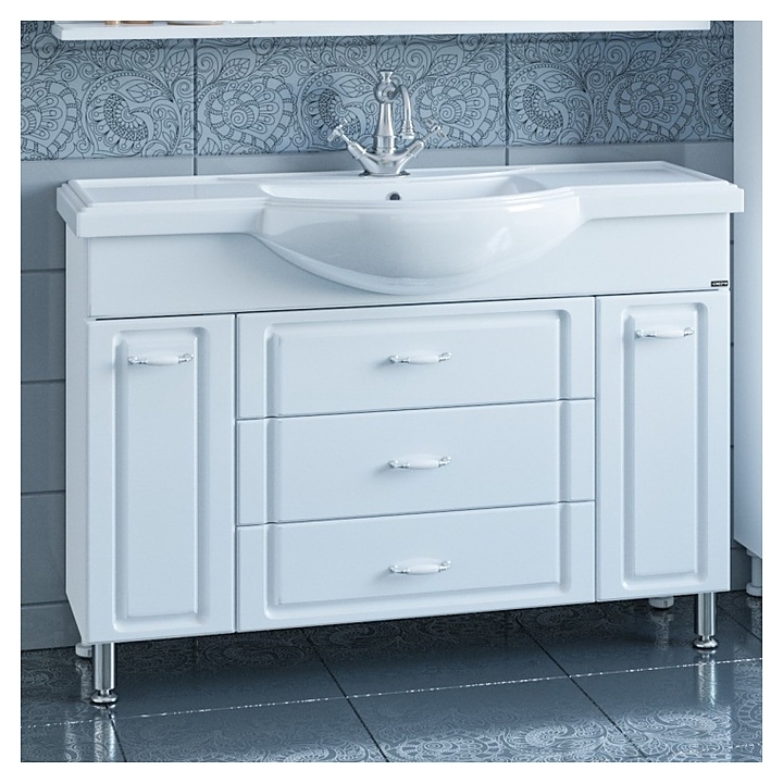 Тумба под раковину СаНта Монарх 120 дополнит интерьер ванной комнаты. Модель оснащена 3 выдвижными ящиками, 2 распашными дверцами и ножками, защищающими конструкцию от воздействия влаги в случае намокания пола. Корпус выполнен из влагостойкой ЛДСП, фасад - из МДФ с покрытием эмалью для защиты поверхности от внешних воздействий. Тумба используется вместе с раковиной Классик 120. В комплект поставки входят 5 ручек, 2 хромированные и 2 пластиковые ножки. Особенности: