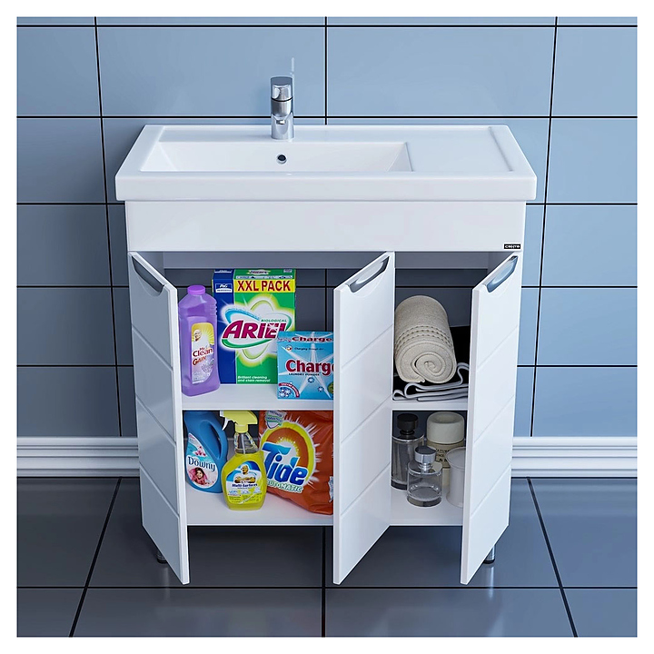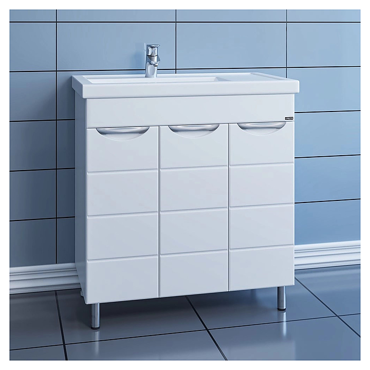 Тумба под раковину СаНта Родос 80 дополнит интерьер ванной комнаты. Модель оснащена 3 распашными дверцами и ножками, защищающими конструкцию от воздействия влаги в случае намокания пола. Изделие выполнено из МДФ и покрыто ПВХ-пленкой для защиты поверхности от внешних воздействий. Тумба используется вместе с раковиной Фостер 80 П. В комплект поставки входят 3 ручки, 2 хромированные и 2 пластиковые ножки. Особенности: