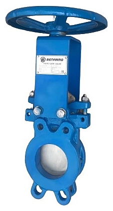 Шиберная задвижка Benarmo 107-5645 используется в очистных сооружениях, системах канализации, целлюлозно-бумажной, пищевой, энергетической, химической, горнодобывающей и других отраслях промышленности для перекрытия потока рабочей среды путем изменения положения запорного ножа перпендикулярно направленным к потоку возвратно-поступательным движением. Корпус, маховик и опорная пластина выполнены из высокопрочного чугуна с шаровидным графитом (GGG40), шток и нож – из нержавеющей стали (SS304), крышка – из стали (Ст25), защитная пластина – из стали (Q235), опорная шайба – из хромистой стали (GCr15), сальник – из стали, гайка – из латуни, седловое уплотнение – из бутадиен нитрильной резины (NRB), направляющая – из политетрафторэтилена (PTFE), сальниковое уплотнение – из этиленпропилендиенового мономера (EPDM) и политетрафторэтилена (PTFE). Особенности: