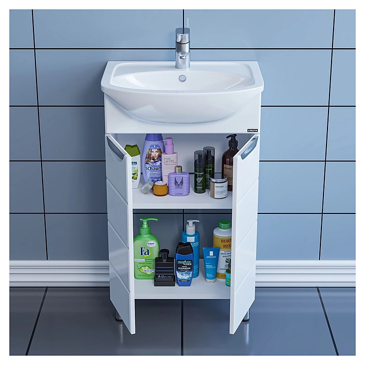 Тумба под раковину СаНта Родос 50 дополнит интерьер ванной комнаты. Модель оснащена 2 распашными дверцами и ножками, защищающими конструкцию от воздействия влаги в случае намокания пола. Корпус выполнен из влагостойкой ЛДСП, фасад - из МДФ и покрыт ПВХ-пленкой для защиты поверхности от внешних воздействий. Тумба используется вместе с раковиной Уют 50. В комплект поставки входят 2 ручки, 2 хромированные и 2 пластиковые ножки. Особенности: