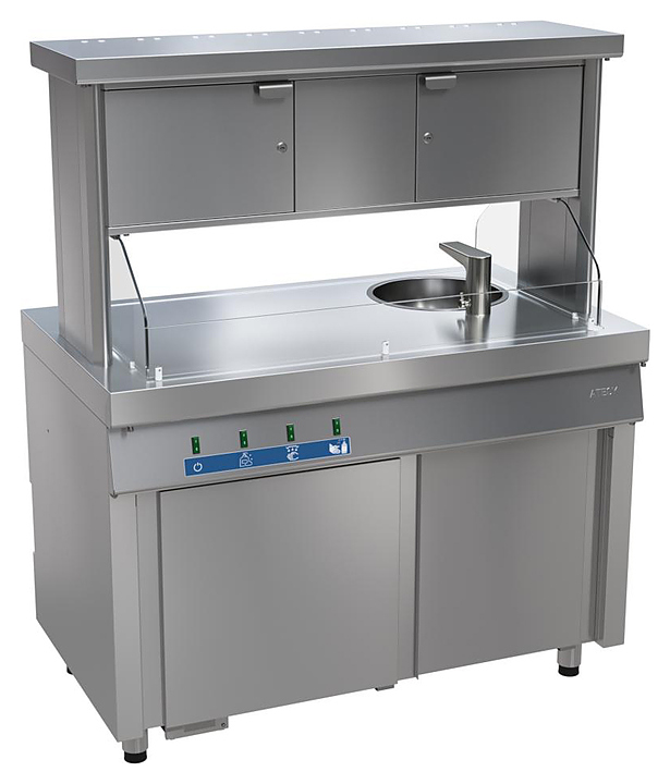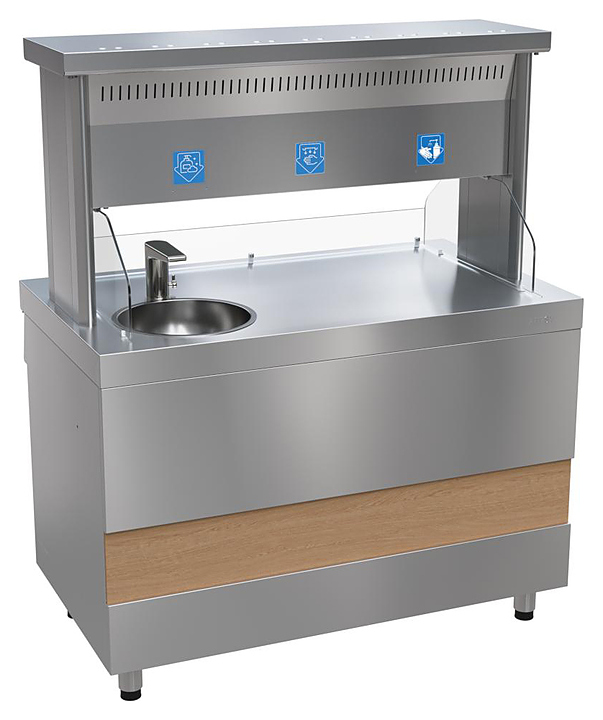 Модуль дезинфекции рук ATESY Ривьера МДР-1200-02 используется в составе линии раздачи Ривьера на предприятиях общественного питания и торговли для санитарной обработки рук посетителей. Модель оснащена мойкой и сушилкой для рук, а также автоматическими дозаторами антисептика и жидкого мыла. Все конструктивные элементы выполнены из коррозионностойкой стали, гарантирующей длительную эксплуатацию. Особенности: