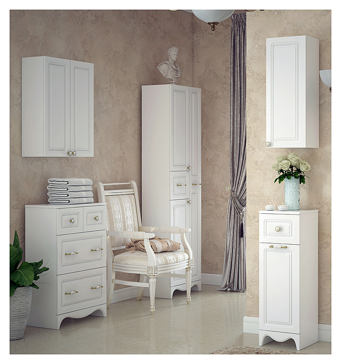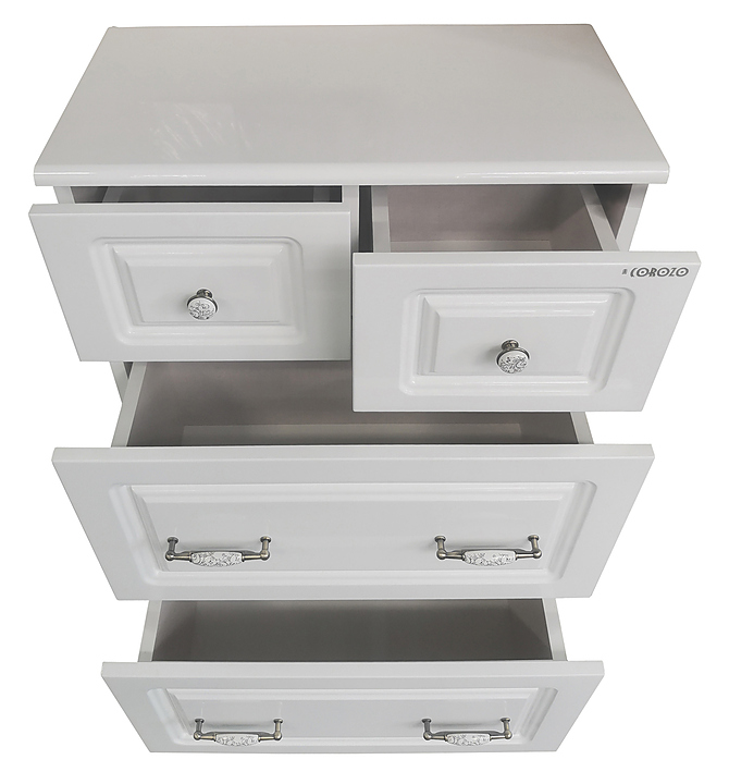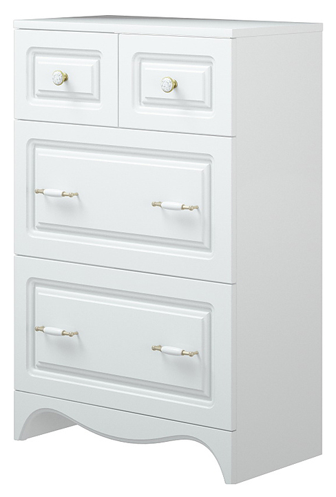 Комод Corozo Классика 55 SD-00000329 выполнен в современном, лаконичном стиле и отлично дополнит интерьер любой ванной комнаты. Модель оснащена 2 небольшими ящиками сверху и 2 глубокими ящиками снизу на шариковых направляющих. Напольная конструкция обеспечивает легкий монтаж и не требует специального ремонта в помещении. Крышка, фасады, цоколь выполнены из МДФ в белой глянцевой эмали, а корпус и боковины - ЛДСП и также покрашены в эмаль. Комод может использоваться в составе гарнитура с зеркалами серии Классика. Особенности: