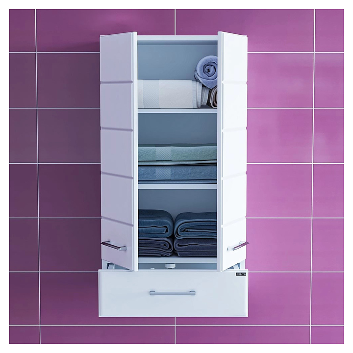 Шкаф СаНта Омега 48х90 дополнит интерьер ванной комнаты. Благодаря подвесной конструкции модель не занимает много места, что позволяет экономить пространство, а также облегчает уборку. Модель оснащена 2 распашными дверцами и выдвижным ящиком. Корпус выполнен из влагостойкой ЛДСП, а фасад - из МДФ и покрыт ПВХ-пленкой для защиты от внешних воздействий. Особенности: