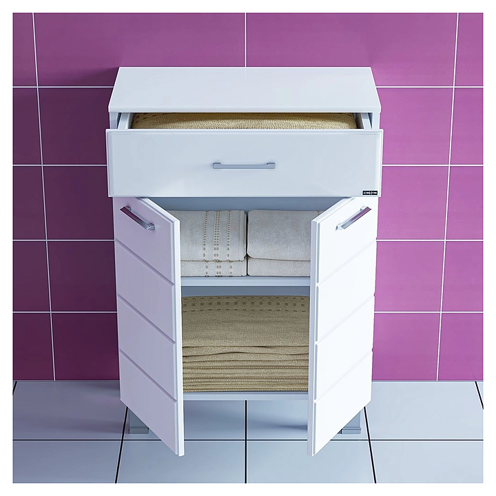 Напольная тумба СаНта Омега 60 дополнит интерьер ванной комнаты. Модель оснащена 2 распашными дверцами, выдвижным ящиком и ножками, защищающими конструкцию от воздействия влаги в случае намокания пола. Корпус выполнен из влагостойкой ЛДСП, фасад - из МДФ и покрыт ПВХ-пленкой для защиты поверхности от внешних воздействий. В комплект поставки входят 3 ручки, 2 хромированные и 2 пластиковые ножки. Особенности: