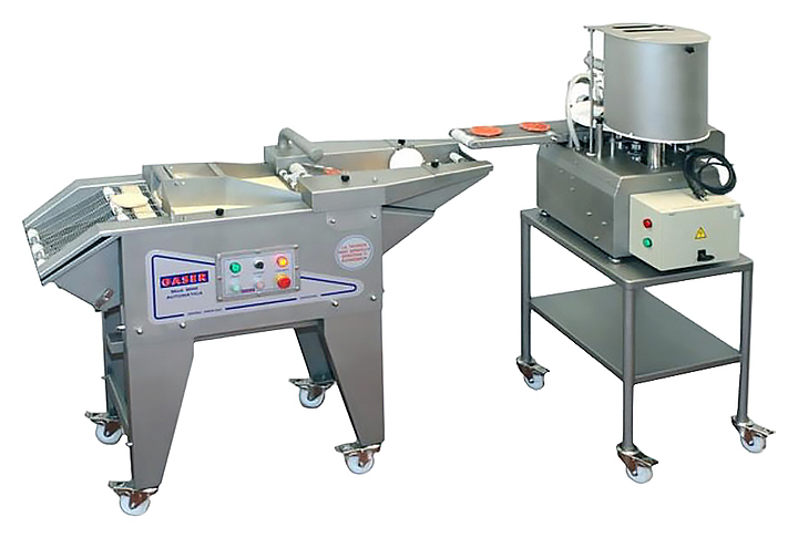 Котлетоформовочная машина Gaser Super-Maxi предназначена для формования гамбургеров, котлет, рубленых бифштексов из мясного фарша на предприятиях общественного питания и торговли. Модель оснащена бункером для фарша, транспортерной лентой и функцией прокладывания бумажной подложки круглой, овальной или квадратной формы с 1 стороны. Изделие выполнено из нержавеющей стали и пищевого пластика. Особенности:
