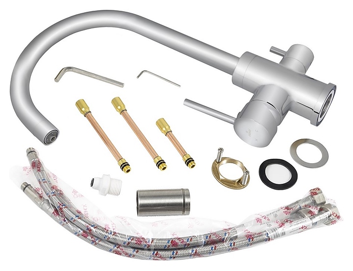 Смеситель Kaiser Mercur 26744 предназначен для использования в кухонных помещениях для подачи холодной и горячей воды. Модель оснащена сдвоенным аэратором и отдельной трубкой для фильрованной воды, благодаря чем исключается возможность смешивания с проточной водой, а также керамическим картриджем, обеспечивающим плавный ход рычага смесителя, контроль и точность при выборе напора и температуры воды. Изделие выполнено из высококачественной латуни, отличающейся прочностью, долговечностью и устойчивостью к перепадам температур. В комплект поставки входят аэратор, гибкая подводка и крепления. Особенности: