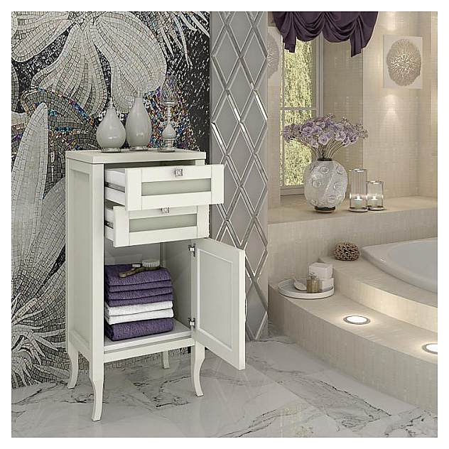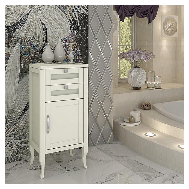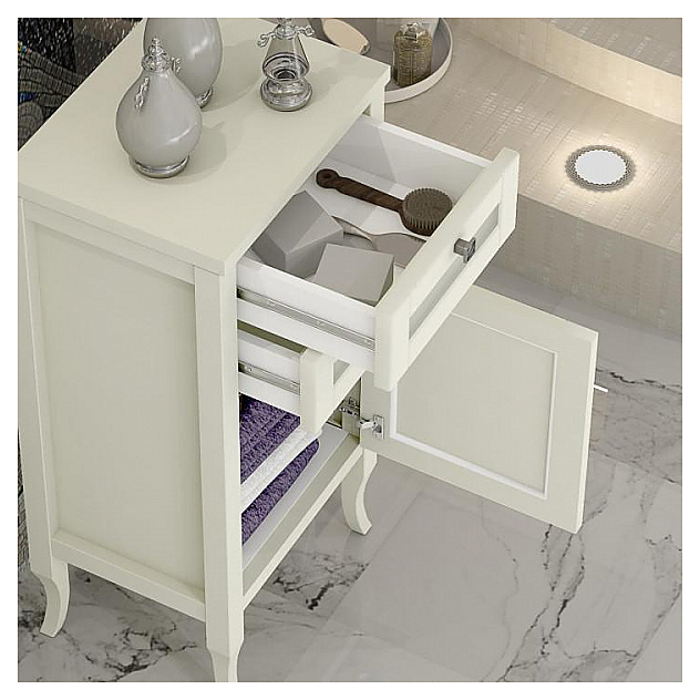 Комод-тумба OPADIRIS Мираж 00-00000046 выполнен в классическом, лаконичном стиле и отлично дополнит интерьер любой ванной комнаты. Модель оснащена распашной фасад-дверцей и 2 небольшими выдвижными ящиками, где удобно хранить необходимые в ванной комнате принадлежности и элементами декора. Напольная конструкция обеспечивает легкий монтаж и не требует специального ремонта в помещении. Корпус изделия выполнен из массива бука и филенки МДФ со шпоном, материал боковых сторон - ЛДСП со шпоном. Комод может использоваться в составе гарнитура для ванной комнаты серии Мираж. Дополнительные характеристики: