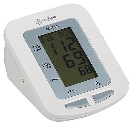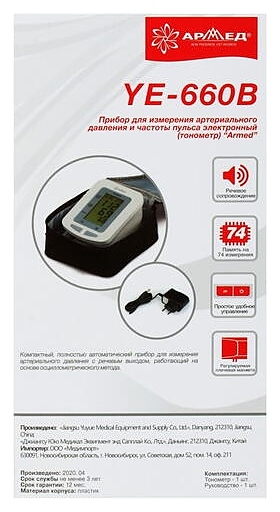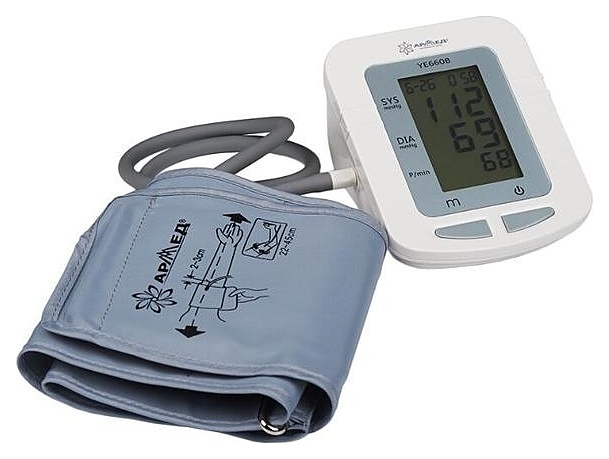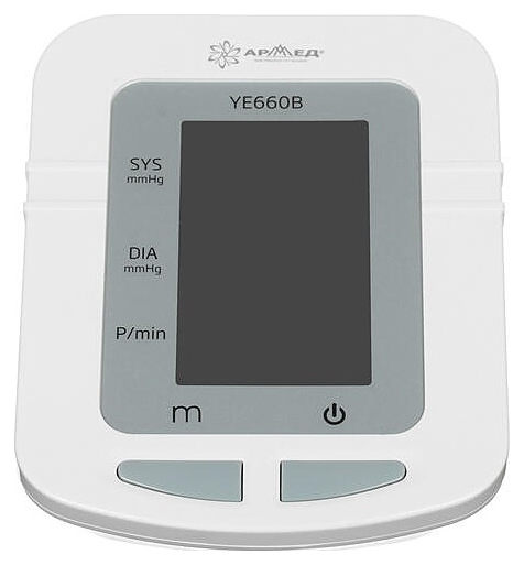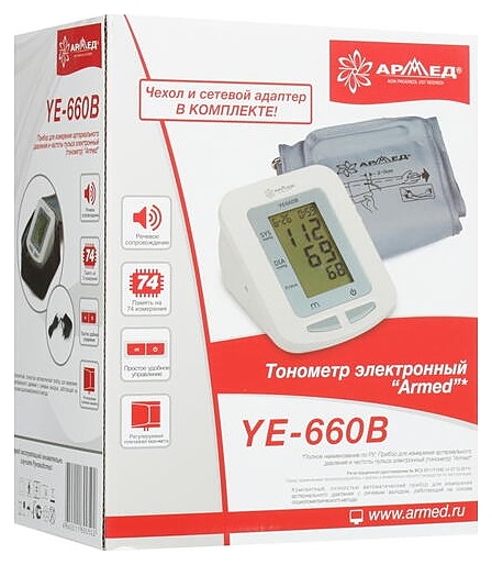Электронный тонометр Армед YE-660B предназначен для измерений максимального (систолического) и минимального (диастолического) артериального давления осциллометрическим методом, а также частоты пульса. Принцип работы основан на анализе параметров сигнала пульсовой волны пациента при снижении давления воздуха в компрессионной манжете. Модель оснащена отсеком для батарей, кнопочной панелью управления с большим информативным цифровым дисплеем. Корпус выполнен из ударопрочного пластика, манжета – из мягкого гипоаллергенного синтетического материала с липучкой для фиксации. В комплект поставки входят компрессионная манжета, сетевой адатер и чехол для хранения. Особенности: