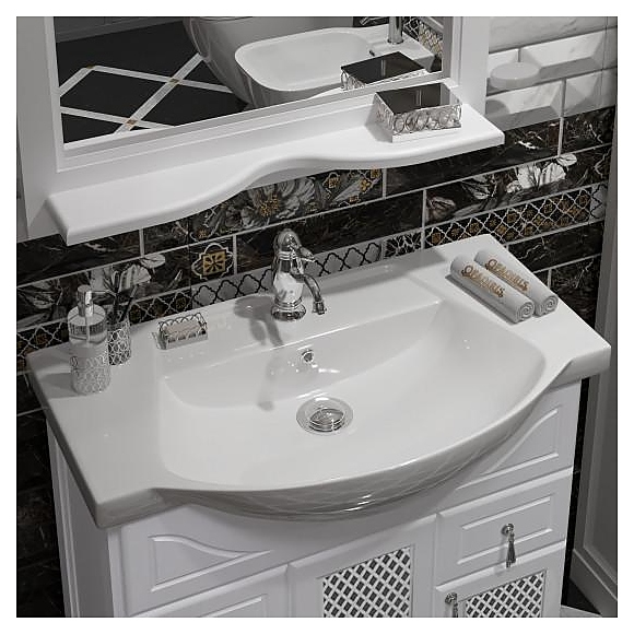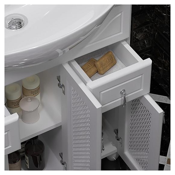 Тумба с решёткой под раковину OPADIRIS Тибет 75 00-00003879 выполнена в классическом стиле. Модель оснащена 3 распашными фасад-дверцами, внутри которых находится полка и 2 выдвижными ящиками в верхней части изделия, где удобно хранить необходимые в ванной комнате личные принадлежности, аксессуары и элементы декора, раковина имеет слив-перелив и одно отверстие для смесителя, расположенное по центру. Напольная конструкция обеспечивает легкий монтаж и не требует специального ремонта в помещении. Благодаря изящной отделке и классическим формам мебель станет украшением любой ванной комнаты. Корпус изделия выполнен из массива бука и МДФ, материал боковых сторон - массив бука и МДФ со шпоном. Тумба приобретается только в комплекте с раковиной на выбор Kirovit Стиль 750 4620008197470 Тумба является частью гарнитура для ванной комнаты Тибет 75 с решеткой, белый матовый.