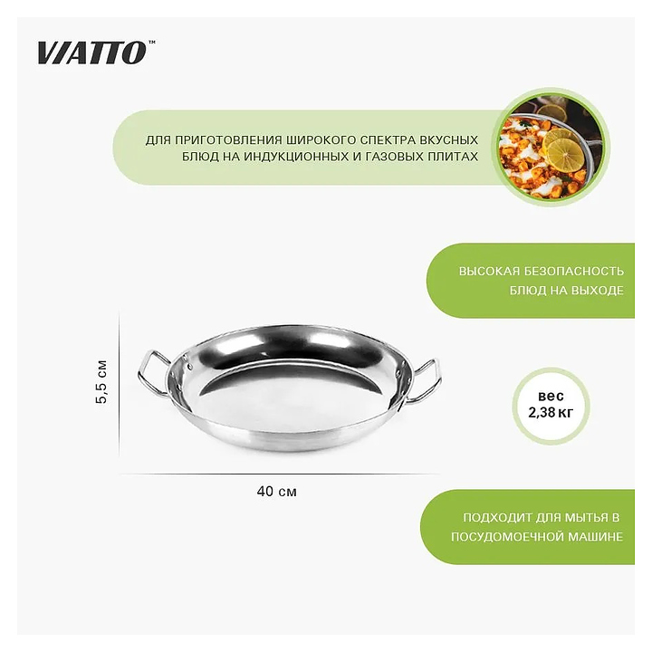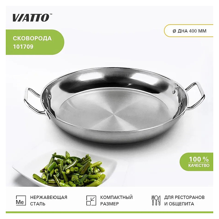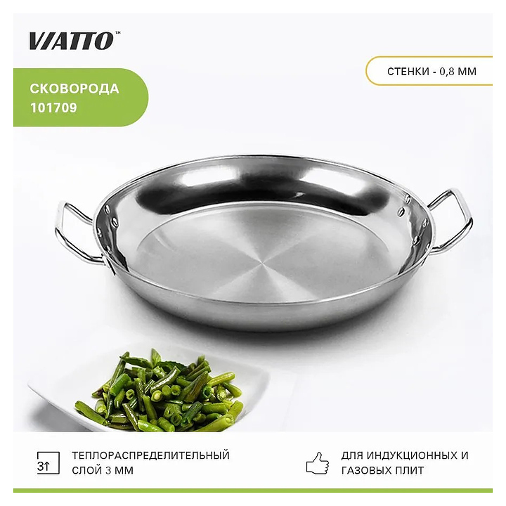 Сковорода VIATTO 101709 используется на предприятиях общественного питания и торговли, в частных домах и квартирах для приготовления широкого спектра блюд. Изделие выполнено из нержавеющей стали, дно - тройное. Дополнительные характеристики: