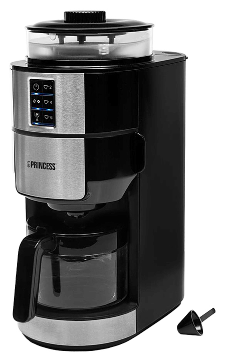 Кофеварка Princess 249408 используется в частных домах, квартирах, отелях и офисах для приготовления кофе из молотых зерен. Модель оснащена электронной панелью управления с цифровым дисплеем, встроенной кофемолкой с коническими жерновами и прозрачным бункером для зерен. Корпус выполнен из пластика и нержавеющей стали, колба для кофе - из стекла. В комплект поставки входит мерная ложка для кофе. Особенности: