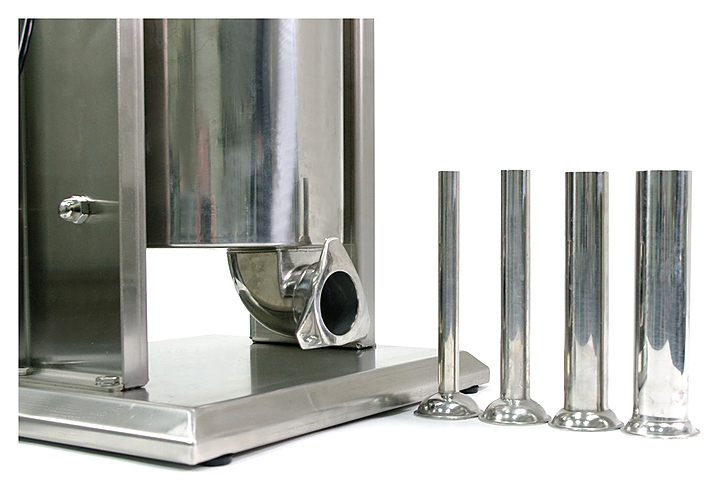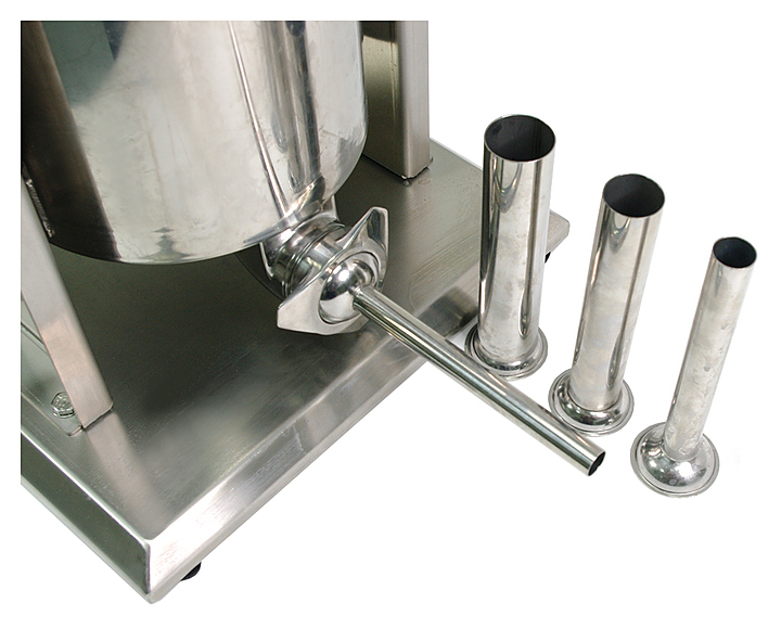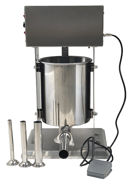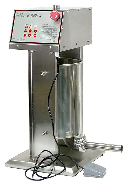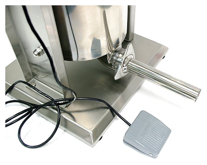 Вертикальный шприц для колбас Kocateq SV15GE используется на предприятиях общественного питания и торговли для изготовления купат и домашних колбас. Модель оснащена электронной панелью управления с кнопками регулирования скорости, опускания и поднятия поршня. Корпус выполнен из нержавеющей стали AISI 304. В комплект поставки вxодят 3 воронки-цевки из нержавеющей стали с входным диаметром 22, 32, 38 мм и ножная педаль. Особенности: