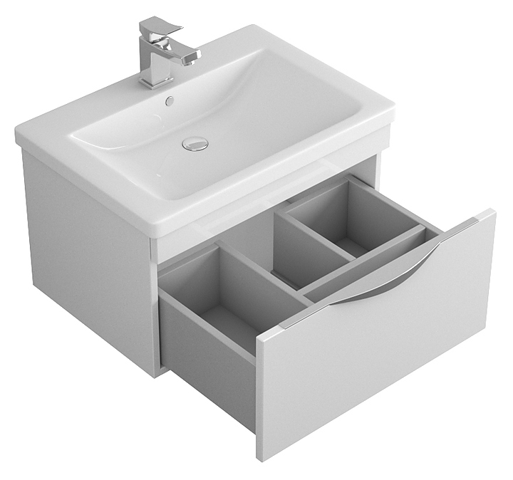 Тумба подвесная под раковину OWL Sjel 65 OW25.01.00 выполнена в современном стиле и за счет своего элегантного дизайна легко впишется в любой интерьер. Модель оснащена ящиком полного выдвижения с системой разделения пространства, где удобно хранить необходимые в ванной комнате личные принадлежности, аксессуары и элементы декора. Благодаря подвесной конструкции изделие не занимает много места и обеспечивает легкую уборку в ванной комнате. Корпус тумбы выполнен из ЛДСП, фасады - из высококачественной МДФ белого цвета, торцевые ручки - полированный алюминий. Тумба приобретается только в комплекте с раковиной Soft OWLB20-13065. Тумба является частью гарнитура для ванной комнаты Sjel 65. Особенности: