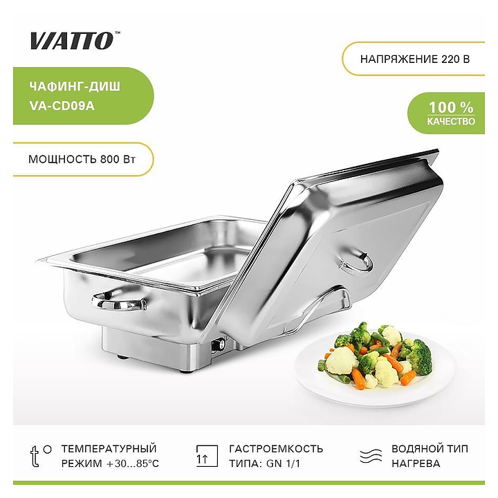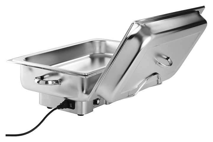 Чафинг-диш VIATTO VA-CD09A предназначен для поддержания в горячем состоянии широкого спектра блюд на предприятиях общественного питания и торговли, а также в местах, где отсутствует доступ к электросети. Модель оснащена 1 гастроемкостью со съемной крышкой и терморегулятором. Корпус и емкость выполнены из нержавеющей стали. Дополнительные характеристики: