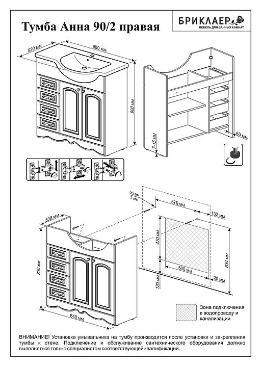 Тумба под раковину БРИКЛАЕР Анна 90 см напольная, правая, белый глянец