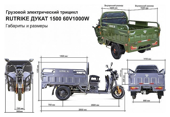 Грузовой электроцикл Rutrike Дукат 1500 60V1000W используется для работы на складах, промышленных предприятиях, для обслуживания больших территорий, отелей, эко-парков и природных зон. Модель оснащена тяговым бесщеточным двигателем нового поколения, который выдаёт на 30% больше крутящего момента. Аккумуляторные батареи в комплект поставки не входят и приобретаются отдельно. Внимание! Данная конструкция не предусмотрена для фиксации кузова в поднятом положении, а лишь для облегчения его подъёма! Особенности: