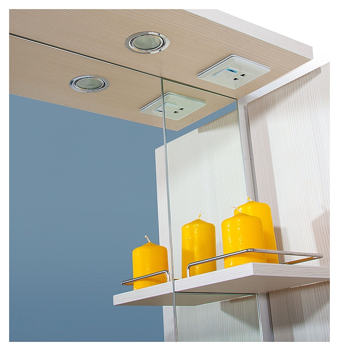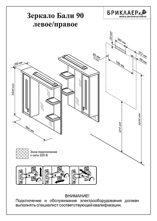 Зеркало БРИКЛАЕР Бали 90 выполнено в стиле модерн и отлично дополнит интерьер любой ванной комнаты. Благодаря подвесной конструкции модель не занимает много места, что позволяет экономить пространство в небольшой ванной комнате. Модель оснащена козырьком со светильником, закрытым шкафчиком с разделительными полками внутри, а также 2 открытыми полочками с ограничителями. Корпус выполнен из ламинированной влагостойкой ДСП, фасад - из МДФ с покрытием краской, ручки - из хромированного металла с тонким защитным слоем, устойчивым к механическим повреждениям. Зеркальное полотно покрыто серебром с амальгамой, благодаря чему в период эксплуатации зеркало не деформируется, а отражение не искажается. В комплект поставки входят навески для крепления к стене, 2 металлических ограничителя полок, 2 галогеновых светильника со сменными лампами 12 V, выключатель с розеткой и электрический провод 0.5 м для подключения к электросети 220 В, металлическая ручка и петли с доводчиками. Особенности: