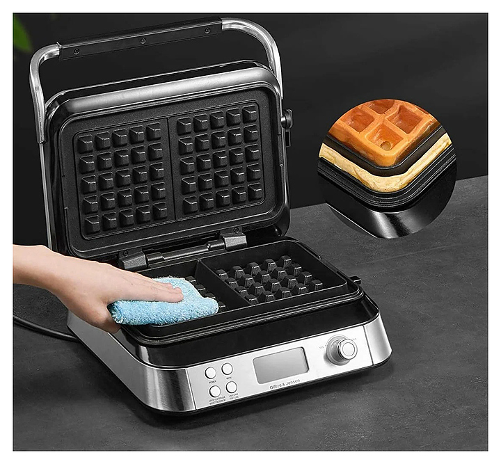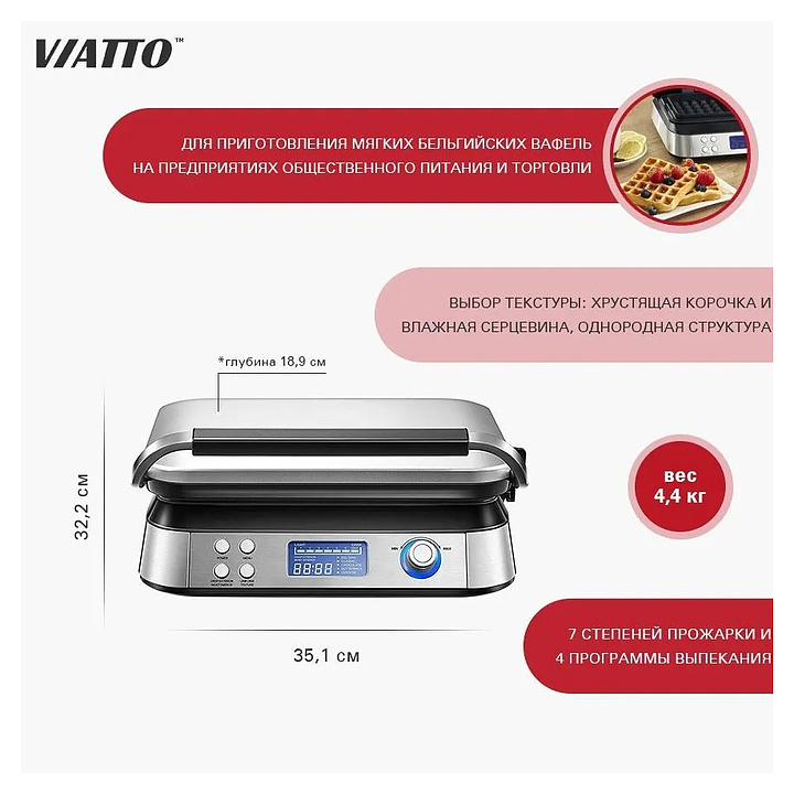 Вафельница VIATTO VA-WM4D предназначена для приготовления мягких бельгийских вафель на предприятиях общественного питания и торговли. Модель оснащена электронной панелью управления с дисплеем. Корпус выполнен из пластика с отделкой из нержавеющей стали, рабочая поверхность - из алюминия с антипригарным покрытием. Особенности: