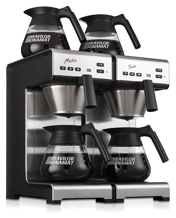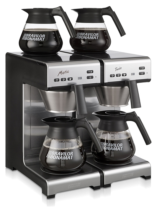 Кофеварка Bravilor Bonamat Matic Twin используется на предприятиях общественного питания и торговли для приготовления фильтрованного кофе. Модель оснащена 2 системами кофеварения, 4 саморегулируемыми плитами нагрева дна, которые поддерживают оптимальную температуру кофе, индикаторами готовности кофе и удаления накипи. Корпус выполнен из высококачественной нержавеющей стали, черные детали - из синтетических материалов. В комплект поставки входят 4 стеклянных графина и 2 фильтродержателя из нержавеющей стали. Дополнительные характеристики: