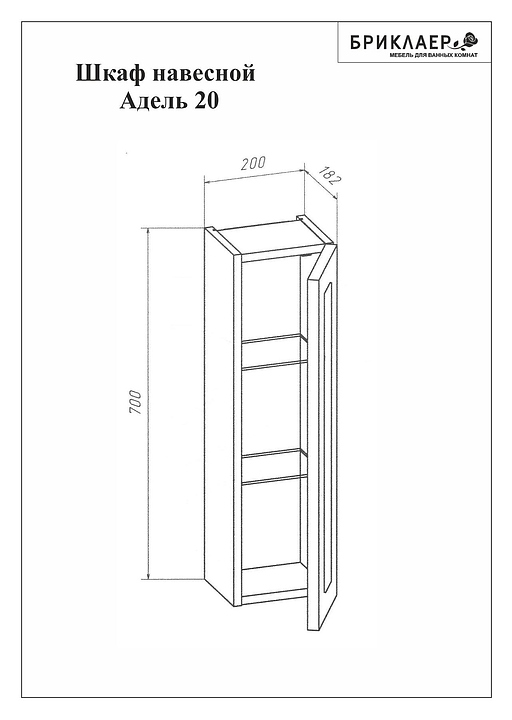 Шкаф БРИКЛАЕР Адель 20 выполнен в эко-стиле и отлично дополнит интерьер любой ванной комнаты. Модель оснащена распашной дверцей и 2 стеклянными полками внутри, где удобно разместить все необходимые личные принадлежности. Благодаря подвесной конструкции модель не занимает много места, что позволяет экономить пространство в небольшой ванной комнате, а также облегчает уборку. Корпус изделия выполнен из влагостойкой ЛДСП, отличающейся влагостойкостью, прочностью, устойчивостью к перепадам температурных режимов, способностью сохранять цвет и форму изделия в первозданном виде длительный срок, фасад - из МДФ, фурнитура - из хромированного металла. В комплект поставки входят подвесы для крепления к стене и стеклянные полочки. Особенности: