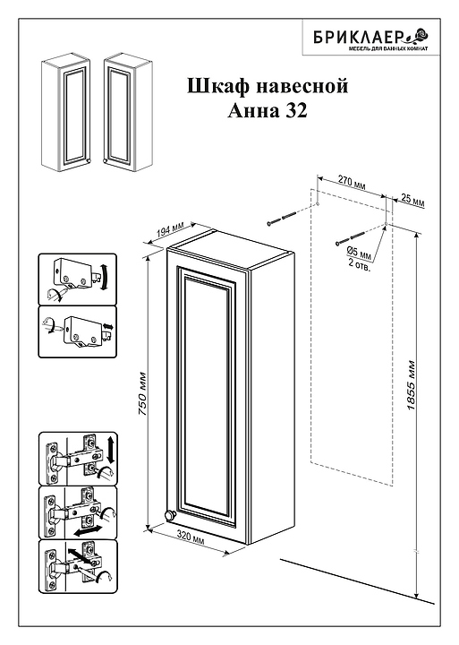 Шкаф подвесной БРИКЛАЕР Анна 32 32х75 см правый, белый глянец