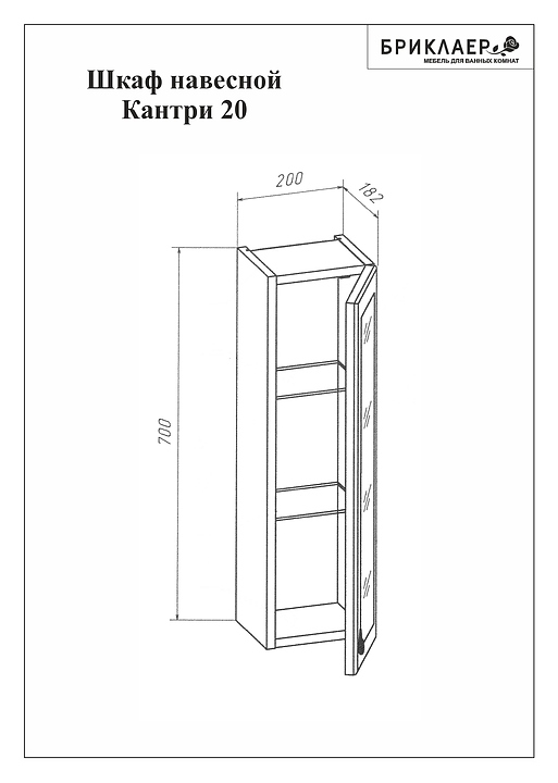 Шкаф БРИКЛАЕР Кантри 20 выполнен в стиле прованс и отлично дополнит интерьер любой ванной комнаты. Модель оснащена распашной дверцей и 2 стеклянными полочками внутри, на которых удобно разместить все необходимые личные принадлежности. Благодаря подвесной конструкции модель не занимает много места, что позволяет экономить пространство в небольшой ванной комнате, а также облегчает уборку. Корпус изделия выполнен из влагостойкой ЛДСП, отличающейся прочностью, устойчивостью к перепадам температурных режимов, способностью сохранять цвет и форму изделия в первозданном виде длительный срок, фасад - из МДФ. В комплект поставки входят подвесы для крепления к стене. Особенности: