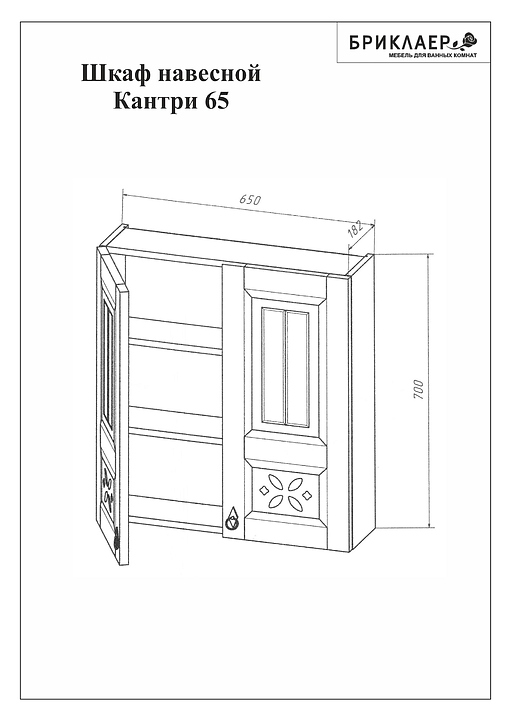 Шкаф БРИКЛАЕР Кантри 65 выполнен в стиле прованс и отлично дополнит интерьер любой ванной комнаты. Модель оснащена отделением с 2 распашными дверцами и 2 деревянными полочками внутри, на которых удобно разместить все необходимые личные принадлежности. Благодаря подвесной конструкции модель не занимает много места, что позволяет экономить пространство в небольшой ванной комнате, а также облегчает уборку. Корпус изделия выполнен из влагостойкой ЛДСП, отличающейся прочностью, устойчивостью к перепадам температурных режимов, способностью сохранять цвет и форму изделия в первозданном виде длительный срок, фасад - из МДФ. В комплект поставки входят подвесы для крепления к стене и 2 металлические ручки. Особенности: