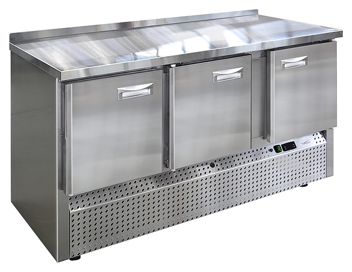 Холодильный стол Finist СХСн-700-3 предназначен для хранения предварительно охлажденных мясных и рыбных полуфабрикатов, заготовок для салатов, молочной продукции, охлажденных напитков и других пищевых продуктов на предприятиях общественного питания и торговли. Модель оснащена расположенным снизу агрегатным отсеком, столешницей с задним бортом, 3 холодильными камерами с распашными дверцами, устойчивыми ножками с подпятниками, кабелем питания с евровилкой и кнопочной панелью управления с цифровым дисплеем. Корпус выполнен из высококачественной нержавеющей стали. Особенности: