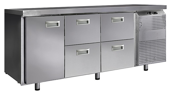 Холодильный стол Finist СХС-700-1/4 предназначен для хранения предварительно охлажденных мясных и рыбных полуфабрикатов, заготовок для салатов, молочной продукции, охлажденных напитков и других пищевых продуктов на предприятиях общественного питания и торговли. Модель оснащена расположенным сбоку агрегатным отсеком, столешницей с задним бортом, холодильной камерой с распашной дверцей, 4 выдвижными ящиками, устойчивыми ножками с подпятниками, кабелем питания с евровилкой и кнопочной панелью управления с цифровым дисплеем. Корпус выполнен из высококачественной нержавеющей стали. Особенности: