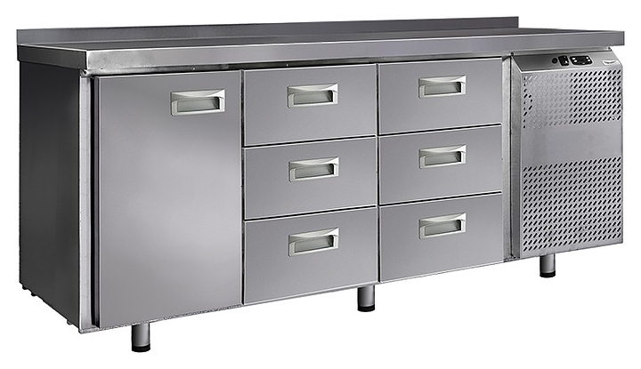 Морозильный стол Finist НХС-600-1/4 предназначен для хранения предварительно замороженных пищевых продуктов на предприятиях общественного питания и торговли. Модель оснащена расположенным сбоку агрегатным отсеком, столешницей с задним бортом, холодильной камерой с распашной дверцей, 4 выдвижными ящиками, устойчивыми ножками с подпятниками, кабелем питания с евровилкой и кнопочной панелью управления с цифровым дисплеем. Цельнозаливной корпус выполнен из высококачественной нержавеющей стали. Особенности: