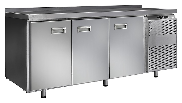 Морозильный стол Finist НХС-600-3 предназначен для хранения предварительно замороженных пищевых продуктов на предприятиях общественного питания и торговли. Модель оснащена расположенным сбоку агрегатным отсеком, столешницей с задним бортом, 3 холодильными камерами с распашными дверцами, устойчивыми ножками с подпятниками, кабелем питания с евровилкой и кнопочной панелью управления с цифровым дисплеем. Цельнозаливной корпус выполнен из высококачественной нержавеющей стали. Особенности: