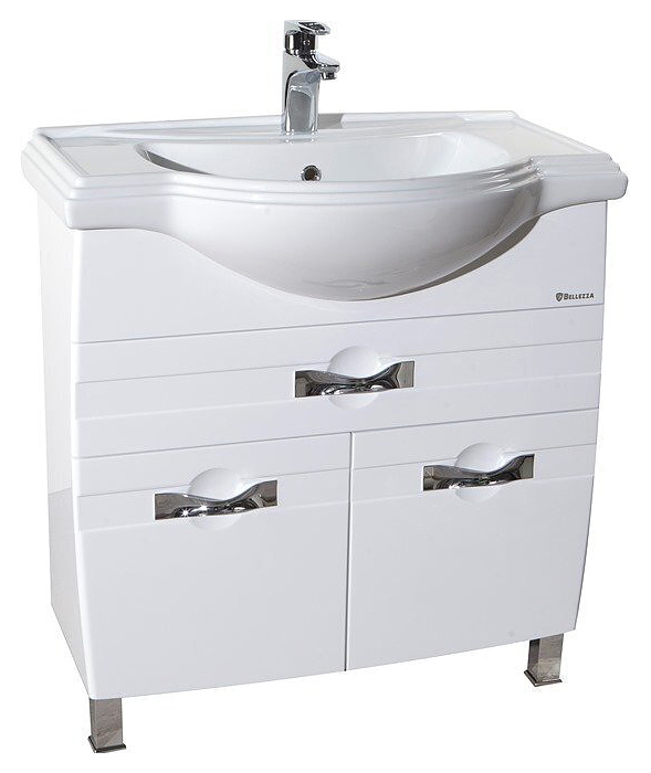 Тумба под раковину Bellezza Абрис 80 дополнит интерьер ванной комнаты. Модель оснащена 2 распашными дверцами, выдвижным ящиком и ножками, защищающими конструкцию от воздействия влаги в случае намокания пола. Корпус выполнен из влагостойкой ЛДСП, фасад - из МДФ. Изделие покрыто глянцевой краской для защиты поверхности от внешних воздействий. Тумба используется вместе с раковиной KIROVIT Классик 800. Дополнительные характеристики: