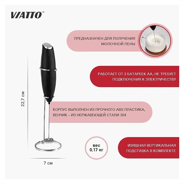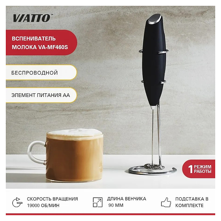 Вспениватель молока VIATTO VA-MF460S предназначен для получения густой кремообразной пены из молока и жирных сливок и последующего приготовления капуччино, латте и других различных напитков на ее основе, а также для взбалтывания яиц и ингридиентов для соусов. Прибор работает от 2 батарей размера AA. Модель оснащена рукояткой с выключателем, венчиком и изящной вертикальной подставкой. Корпус выполнен из прочного черного пластика, венчик – из нержавеющей стали 304. В комплект поставки входит подставка. Батареи не входят в комплект поставки и приобретаются отдельно. Дополнительные характеристики: