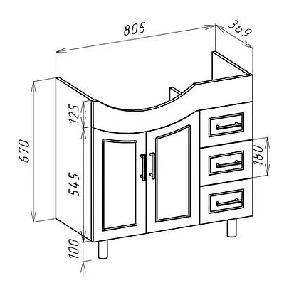 Тумба под раковину Bellezza Коралл 85 L дополнит интерьер ванной комнаты. Тумба оснащена 2 дверцами, 3 ящиками и ножками, защищающими конструкцию в случае намокания пола. Корпус выполнен из ЛДСП, фасад - из МДФ. Изделие покрыто глянцевой эмалью для защиты поверхности от внешних воздействий. Тумба используется вместе с раковиной Santek Коралл 82. В комплект поставки входят доводчики. Особенности:
