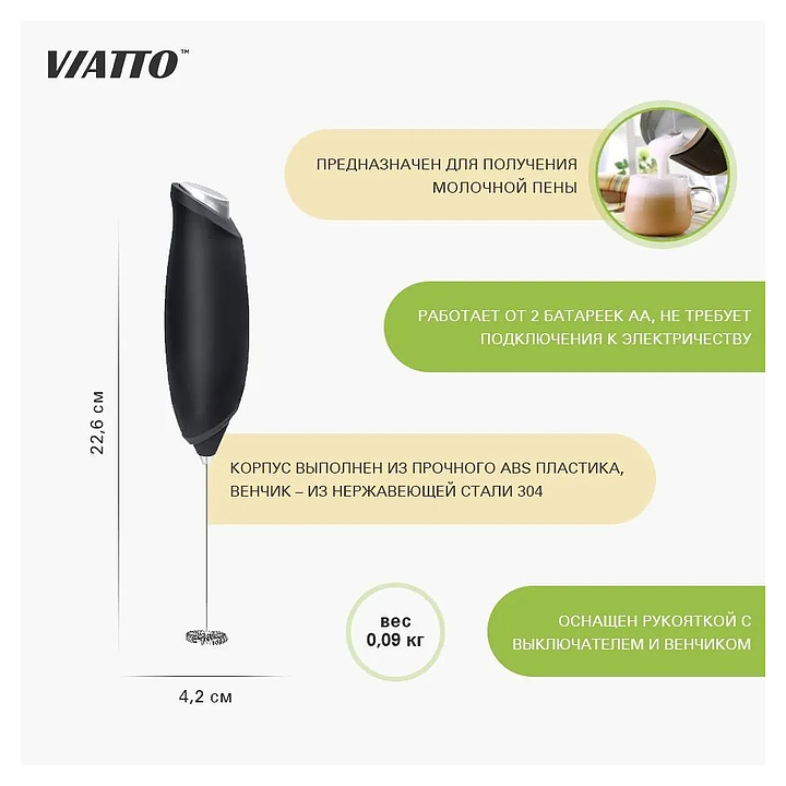 Вспениватель молока VIATTO VA-MF568 предназначен для получения молочной пены и последующего приготовления капуччино, латте и других различных напитков на ее основе, а также для взбалтывания яиц и ингридиентов для соусов. Прибор работает от 2 батарей размера AA. Модель оснащена рукояткой с выключателем и венчиком. Корпус выполнен из прочного черного пластика, венчик – из нержавеющей стали 304. Батареи не входят в комплект поставки и приобретаются отдельно. Дополнительные характеристики: